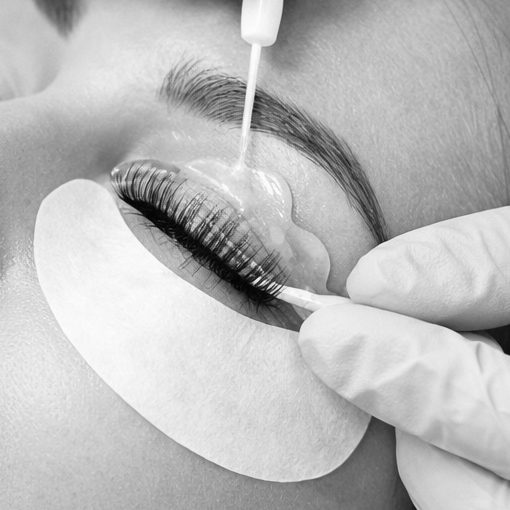 Die Wimpern werden mittels eines Gelkissens und verschiedenen Lotionen gebogen und fixiert.